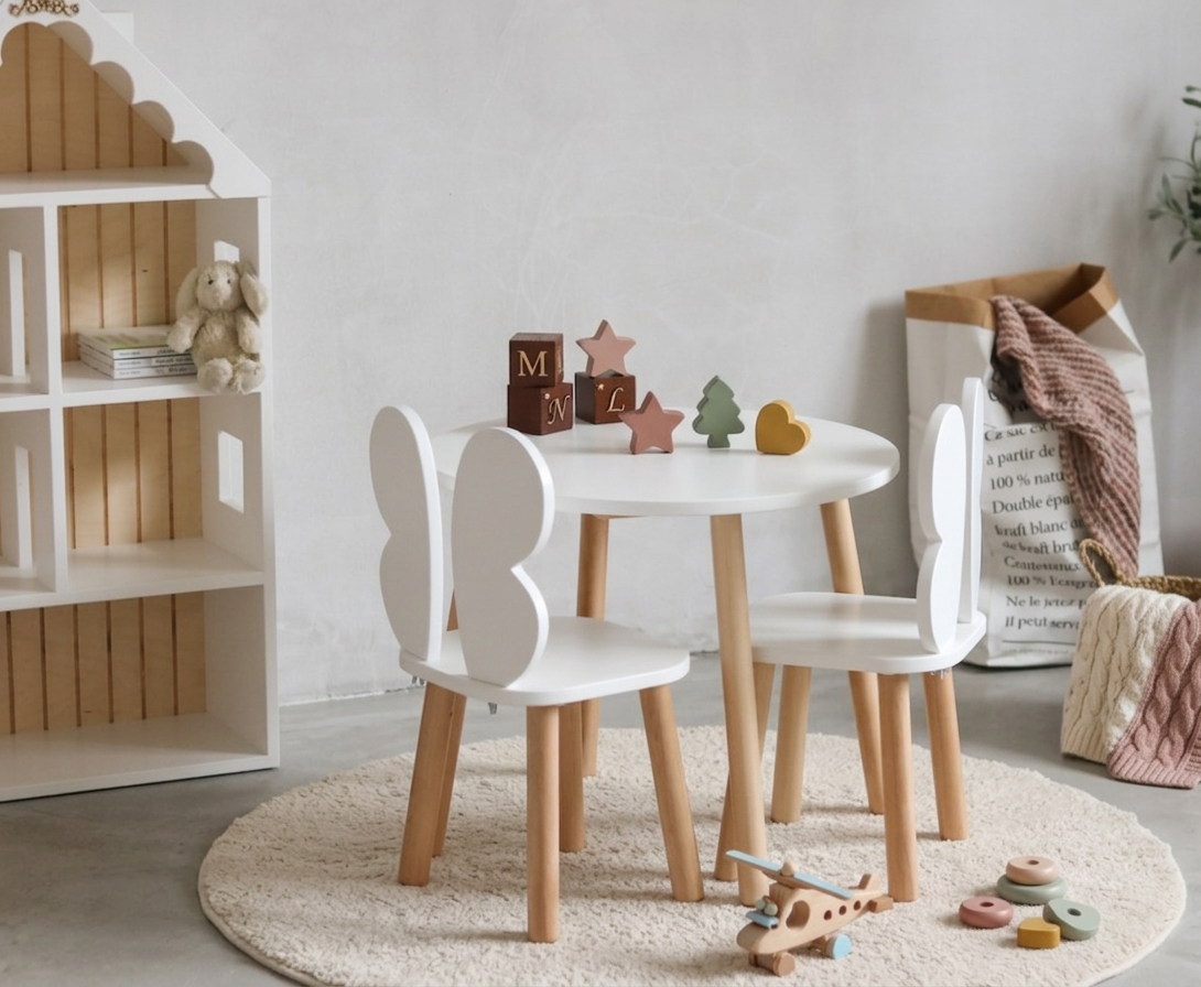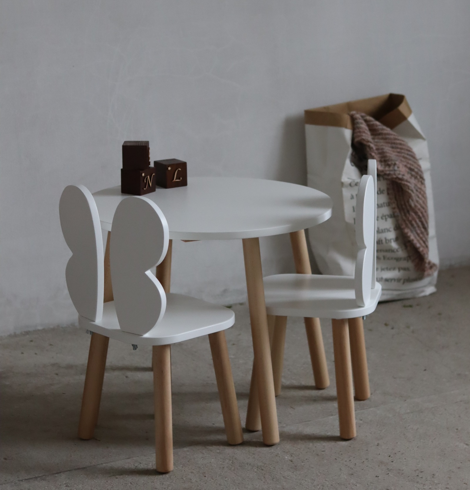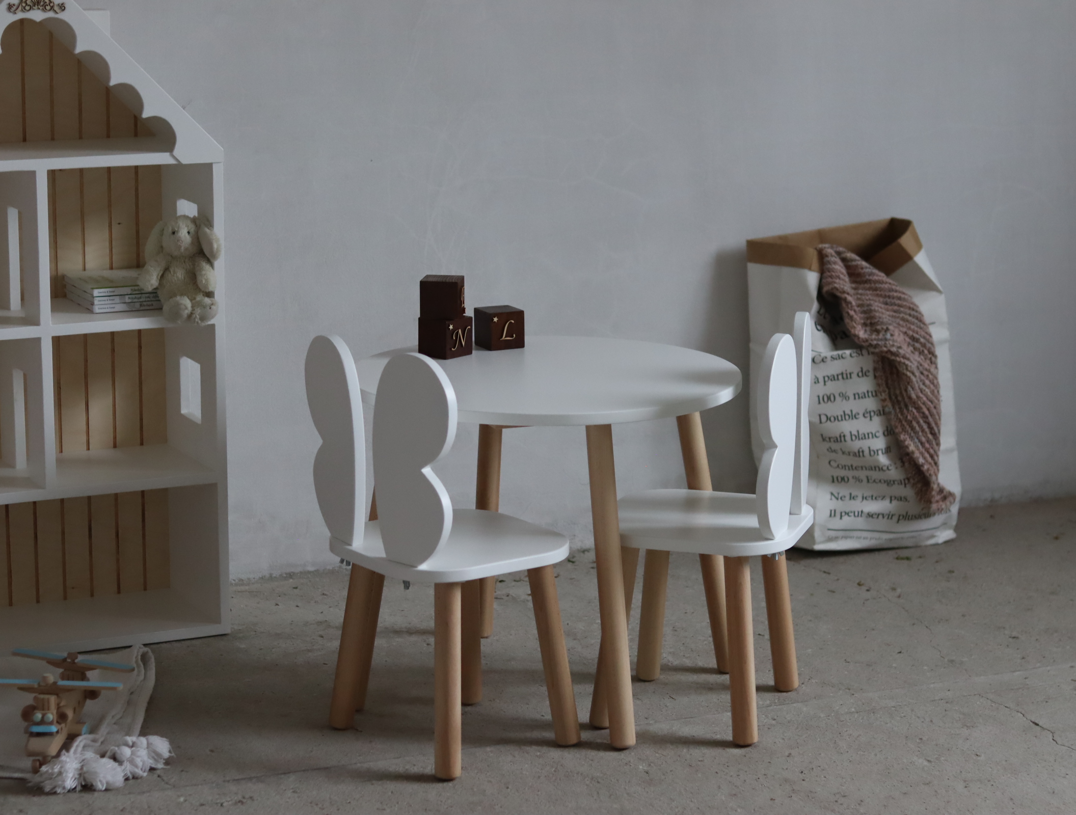 Drewniane krzesełko motyl wraz z okrągłym stolikiem . Pięknie prezentuje się w dziecięcych pokojach pobudzając przy tym wyobraźnię dziecka.