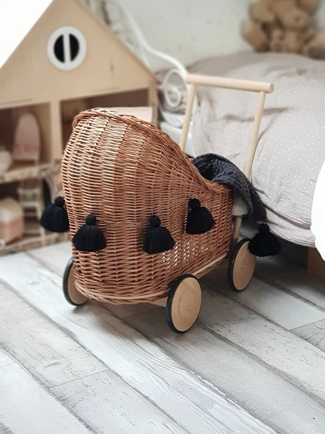 Przepiękny wózek wiklinowy dla lalek, misiów. Wózek w całości wykonany ręcznie z najwyższej jakości wikliny, pochodzącej z polskich gospodarstw. Drewniane kółka z praktycznymi gumowymi osłonami.